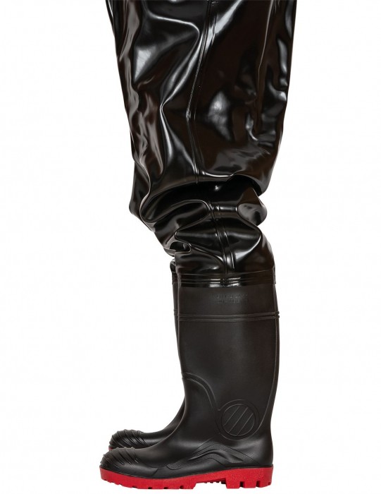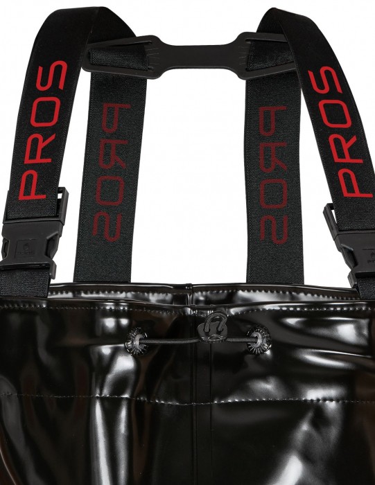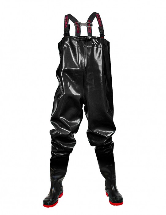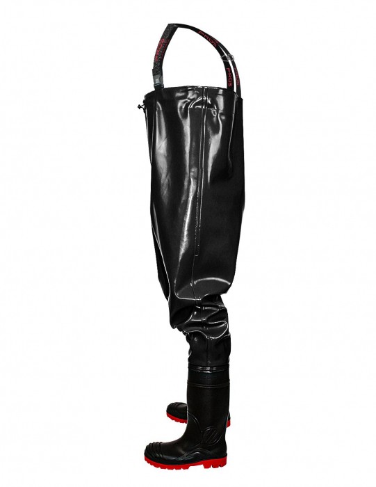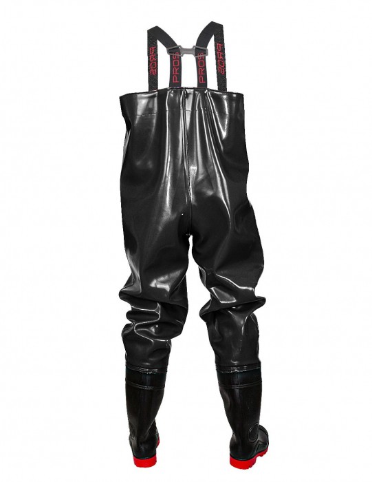 Spodniobuty model SB01 STRONG/ PROS spełniają normyEN 13688 (odzież ochronna, wymagania ogólne)/ EN 343 (odzież ochronna przed deszczem)/ EN 20347- OB SRC (obuwie zawodowe, typ ochrony OB SRC). Rewelacyjne, wytrzymałe spodniobuty z wgrzanymi na stałe kaloszami, regulowaną długością szelek i gumą dopasowującą obwód klatki piersiowej. Występuje w kolorze czarnym w rozmiarach od 39 do 48. Wykonane z wysokiej jakości materiału RUBBER, który jest nową koncepcją materiałów powleczonych PVC. Materiał cechuje się bardzo wysoka odpornością na rozdarcia, wierzchnia warstwa materiału jest odporna na przecięcia i przebicia. Zapewnia pełną ochronę w niesprzyjających warunkach atmosferycznych. Kieszeń wewnętrzna pozwala na przechowywanie dokumentów lub potrzebnych drobiazgów, które chcemy mieć w zasięgu ręki. Technika obustronnego zgrzewania zwiększa wytrzymałość szwów. W pełni nieprzemakalne, do brodzenia w wodzie. Cechują się bardzo dobrymi właściwościami antypoślizgowymi. Solidna podeszwa z grubym protektorem gwarantuje stabilność nawet na miękkim i śliskim podłożu. Wytrzymały materiał zapewnia długotrwałe i komfortowe użytkowanie bez konieczności konserwacji. Fason daje możliwość szybkiego zakładania i zdejmowania. Wygodne i wodoodporne, swobodne w ruchu wodery są niezastąpione dla wędkarzy łowiących w rzekach, wykorzystywane przy połowach i ciężkiej pracy rybackiej. Dają największe możliwości na łowisku. Niezbędne wyposażenie każdego wędkarza chcącego skutecznie łowić na spinning lub muchę. Sprawdzą się również podczas mycia i czyszczenia w wodociągach, kanalizacji i usługach komunalnych.