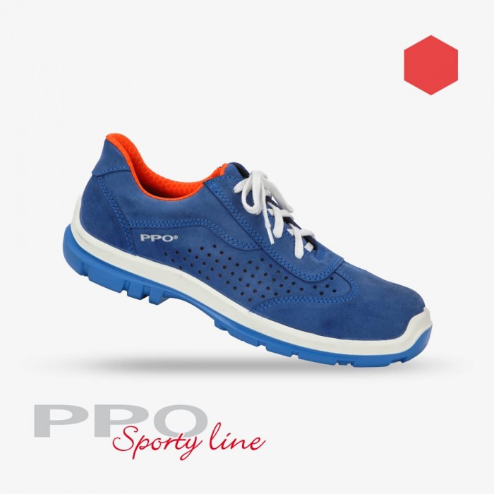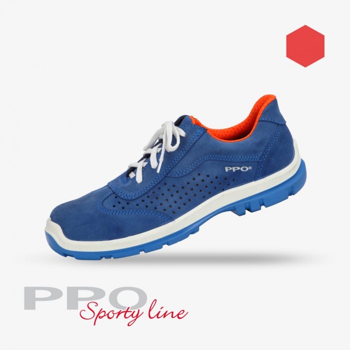 Półbuty z podnoskiem kompozytowym 532/ PPO spełnia normy EN 20345 (środki ochrony indywidualnej - obuwie bezpieczne), S1P (obuwie bezpieczne z ochroną palców stopy za pomocą podnosków testowanych na wytrzymałość uderzenia z energią 200J, zabudowana pięta, właściwości antyelektrostatyczne, absorpcja energii w części piętowej oraz odporność podeszwy na przebicie z siłą 1100N), SRC (odporność na poślizg na podłożu ceramicznym pokrytym roztworem laurylosiarczanu sodu (SLS) i na podłożu ze stali pokrytym glicerolem). Kolekcja PPO Sporty line. Bardzo komfortowe obuwie z podnoskiem. Półbuty w kolorze niebieskim. Rozmiar 39-48. Model w dynamicznym, sportowym stylu, idealny do pracy i nie tylko, wytrzymały, antystatyczny, antypoślizgowy z wkładką antyprzebiciowa. Cholewka wykonane z wysokiej jakości skóry welurowej o wysokim współczynniku przepuszczalności pary wodnej z perforacją. Wewnątrz podszewka z materiału Artico® skutecznie odprowadzająca pot, gwarantująca uczucie suchości i komfortu. Wymienna miękką, higroskopijna wyściółka z filtrem aktywnego węgla o właściwościach przeciwgrzybicznych, przeciwpotnych i antybakteryjnych zapewnia stopie neutralny zapach, uczucie suchości i przyjemnego chłodu. Wyściółka nadaje się do wielokrotnego prania. Lekki kompozytowy podnosek chroni przed uderzeniami z energią do 200J a niemetalowa wkładka antyprzebiciowa chroni przed przekłuciem od podłoża z siłą do 1100N. Innowacyjna, sportowa podeszwa SportyLine® z dwuwarstwowego poliuretanu PU/PU odporna na oleje, benzynę i inne rozpuszczalniki organiczne. Specjalne urzeźbienie podeszwy – system Step Lock® i Traction Grid® gwarantuje wysoką stabilność podeszwy i wysoką ochronę przed poślizgiem. Absorbcja energii w części piętowej, skutecznie łagodzi nierówności podłoża. Obuwie dla wymagających klientów, ceniących trwałość, wytrzymałość, właściwości higieniczne, komfort i wygodę noszenia. Sprawdzi się w branży budowlano - remontowej, montażowej, logistyce, transporcie, na magazynie, hali produkcyjnej.
