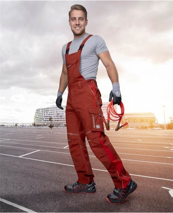 Spodnie robocze ogrodniczki URBAN - doskonała ergonomia i maksymalna swoboda ruchu zapewnione przez technologię Tabiflex. Wytrzymała tkanina canvas posiada doskonałe właściwości mechaniczne i dużą wytrzymałość na rozciąganie oraz przerwanie, potrójne szwy zwiększające wytrzymałość w częściach obciążanych, elastyczny podwyższony stan ze zintegrowaną gumą w pasie zwiększa komfort noszenia, duża ilość praktycznych kieszeni, podwójny materiał w miejscu kolan i kieszenie na nakolannik, pasy odblaskowe w części przedniej i tylnej zwiększające widoczność. Modele w kolorach zielonym i khaki są dodadkowo wyposażone w otwory wentylacyjne zapinane na zamki oraz zastosowano materiał wodoodporny. Materiał: 65% poliester, 35% bawełna, tkanina canvas, gramaryra 270 g/m², Tabiflex - stretch, wzmocnienie: 100% poliamid CORDURA®