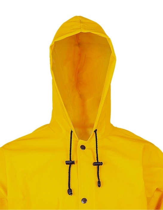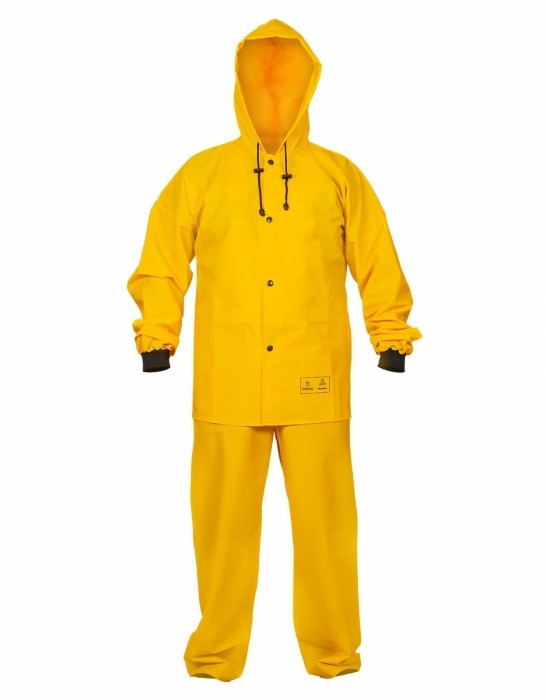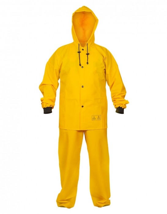 Ubranie złożone z kurtki z kapturem zapinanej na napy oraz spodni ogrodniczek z regulowanymi szelkami z elastyczną, szeroką gumą z tyłu. Model produkowany z wodoochronnej tkaniny Plavitex, przeznaczony do użytku w niesprzyjających warunkach pogodowych. Zapewnia skuteczną ochronę przed wiatrem i deszczem. Technika obustronnego zgrzewania zwiększa wytrzymałość szwów. Produkt spełnia standardy europejskich norm: EN ISO 13688 i EN 343.