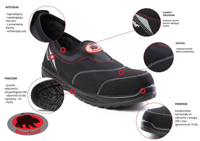 podeszwa wtryskiwana, o podwójnej gęstości, odporna na węglowodory, olejoodporna, antyelektrostatyczna, absorpcja energii pięty, posiada właściwości antypoślizgowe SR,