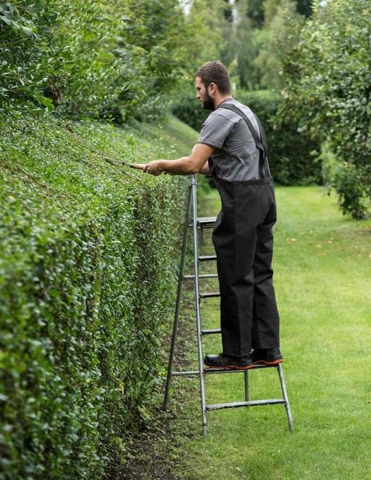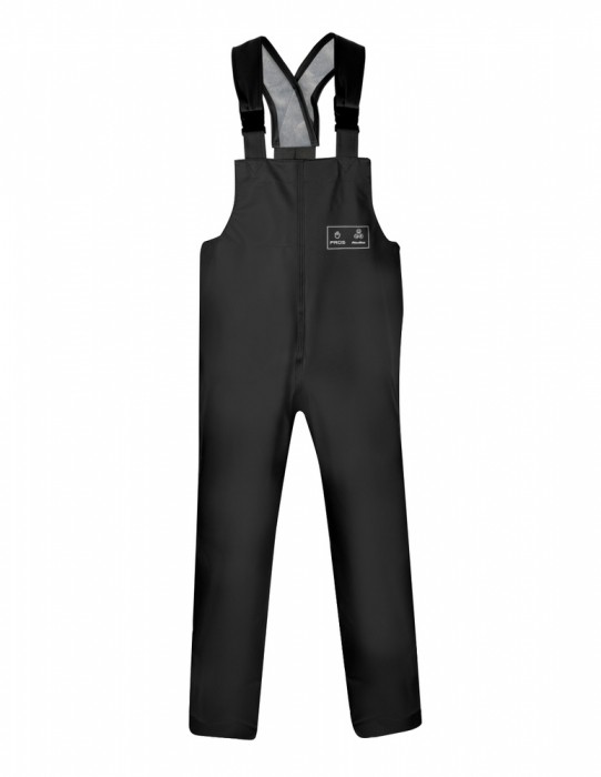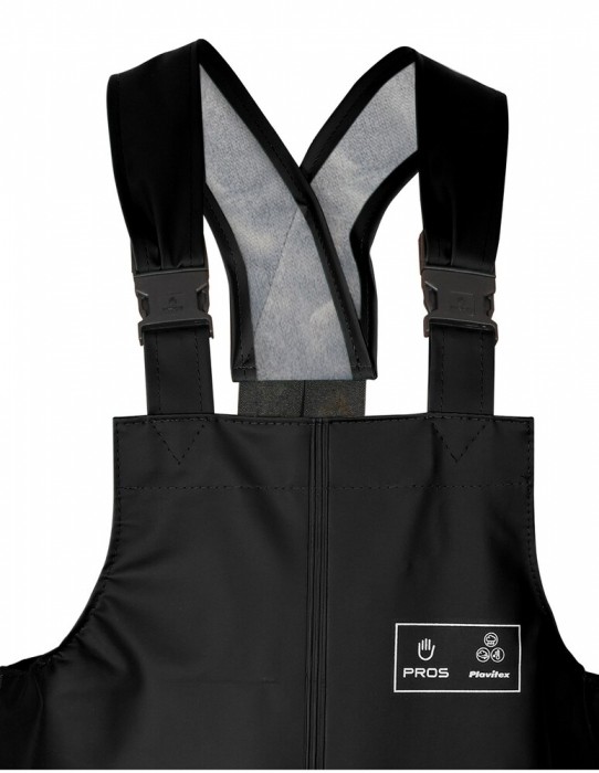 Spodnie ogrodniczki z regulowanymi szelkami z elastyczną, szeroką gumą z tyłu. Model produkowany z wodoochronnej tkaniny Plavitex, przeznaczony do użytku w niesprzyjających warunkach pogodowych. Zapewnia skuteczną ochronę przed wiatrem i deszczem. Technika obustronnego zgrzewania zwiększa wytrzymałość szwów. Produkt spełnia standardy europejskich norm: EN ISO 13688 i EN 343.