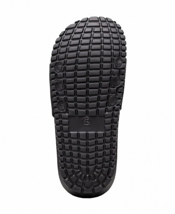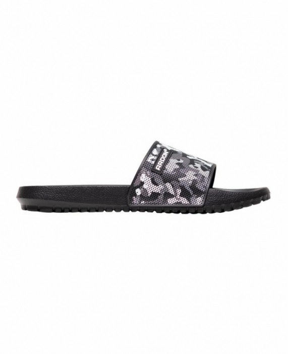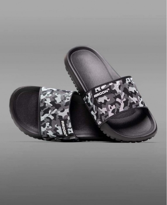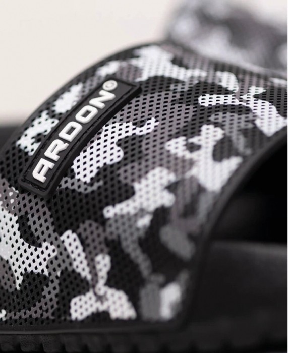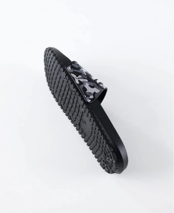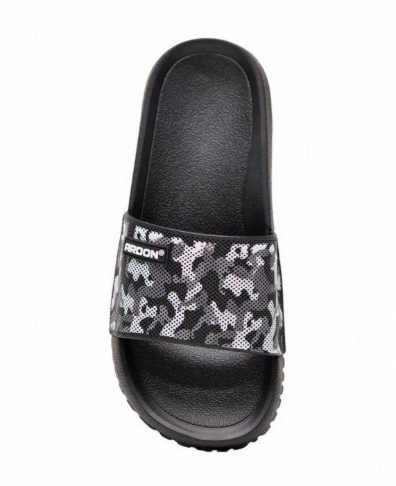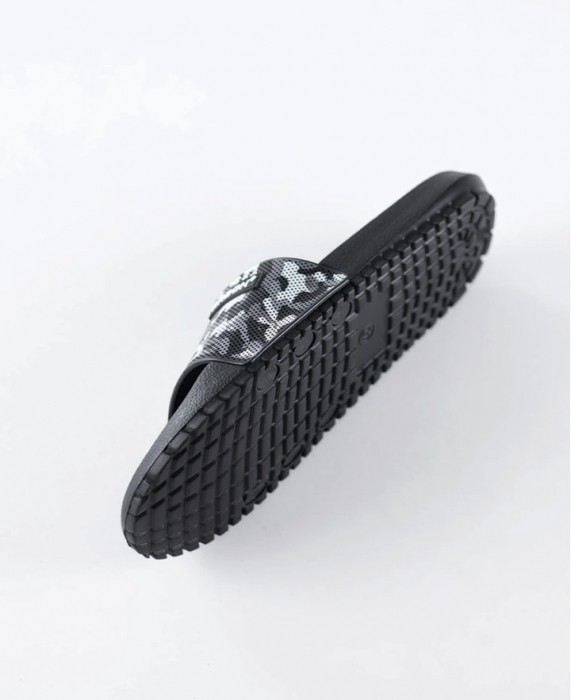 Lekkie i wygodne klapki z czarno-szarym paskiem w deseń moro łączą nowoczesny wygląd z praktycznym zastosowaniem. Trwała cholewka z PVC dobrze trzyma kształt, a elastyczna podeszwa z EVA zapewnia miękki i stabilny krok. Dzięki uniwersalnemu designowi sprawdzają się w łazience, przy basenie oraz w domu, a biały tekst na pasku nadaje im sportowy i wyrazisty charakter.
