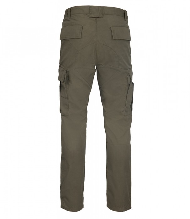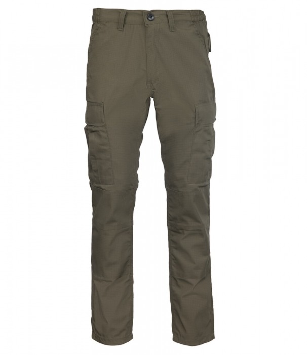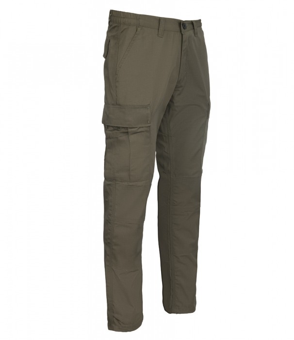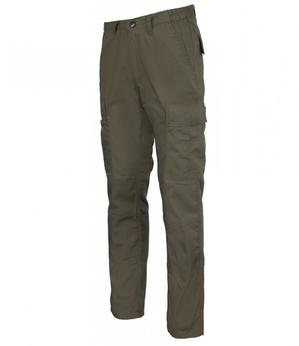 Spodnie wykonane z tkaniny o charakterystycznej fakturze kratki (6x6mm), wzmocnionej poprzez dodanie w stałych odstępach mocniejszych włókien (materiał typu rip-stop), co zapobiega rozdzieraniu się materiału.